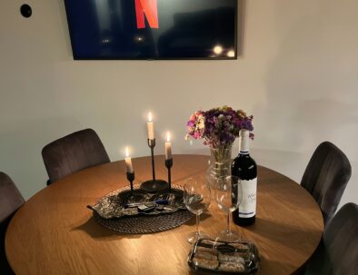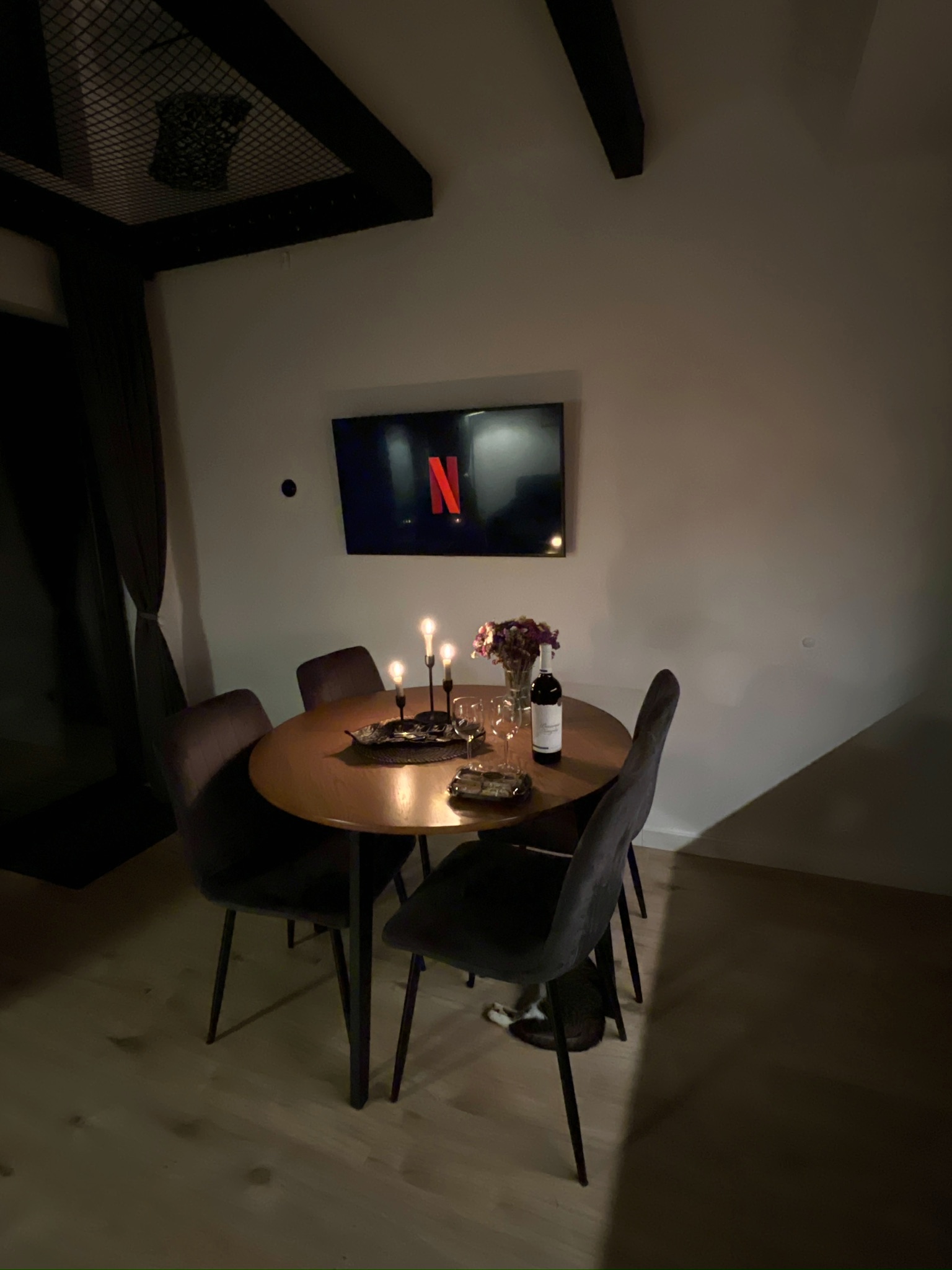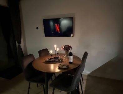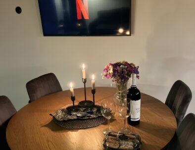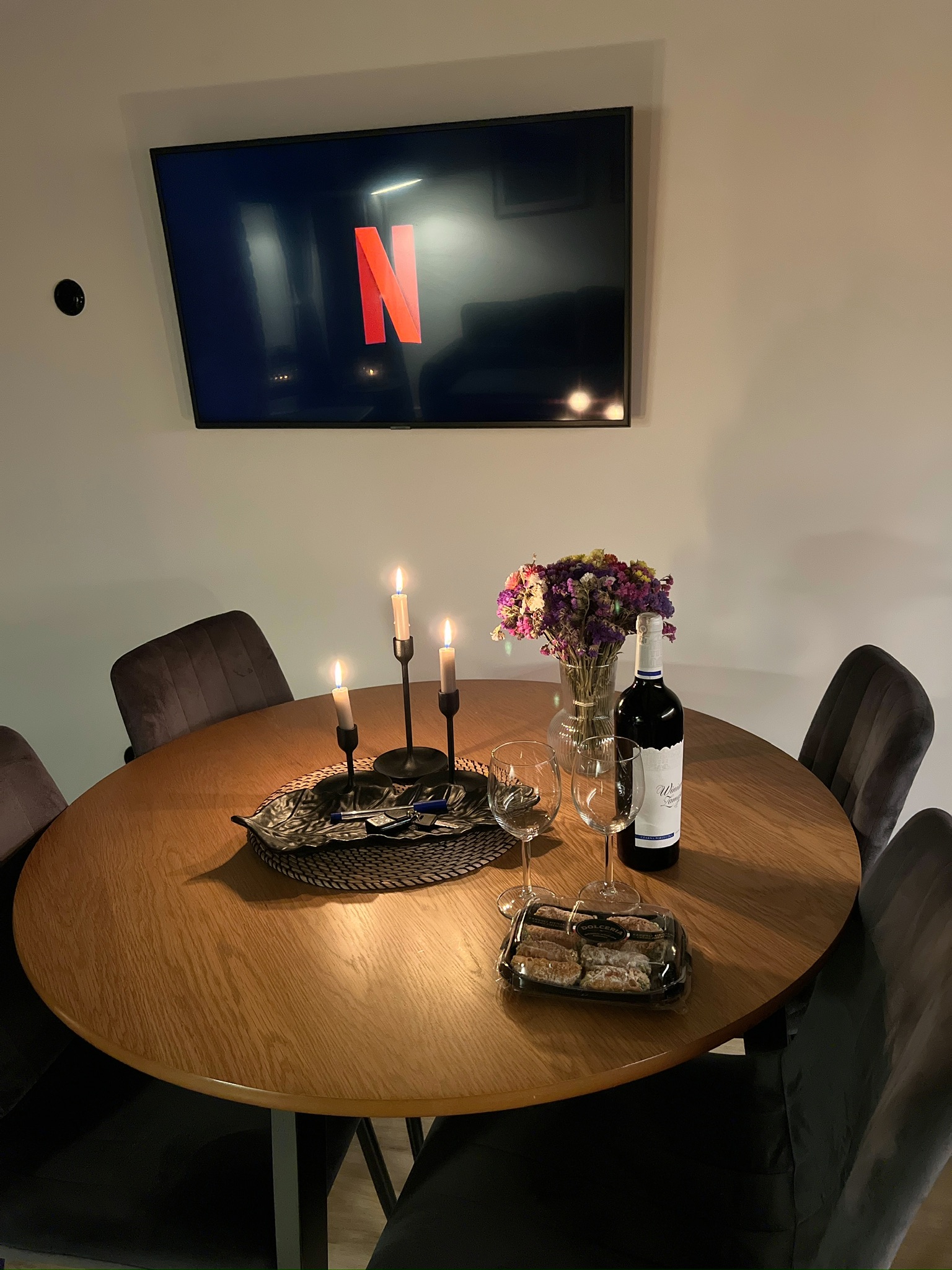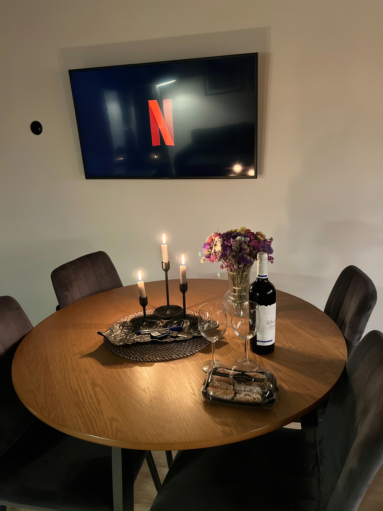 W domku znajdziesz nowoczesny telewizor z płaskim ekranem oraz funkcją smart TV, który umożliwia dostęp do Twoich ulubionych serwisów streamingowych. Wieczory z filmami czy serialami będą przyjemnością w naszym przytulnym salonie.
